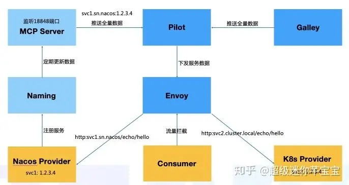 虽然在设计图中,Pilot后端的MCP Server已经有了Consul、Eureka等,但是这些项目目前都没有官方支持的MCP Server。Nacos是目前首个官方支持Istio MCP协议的项目。