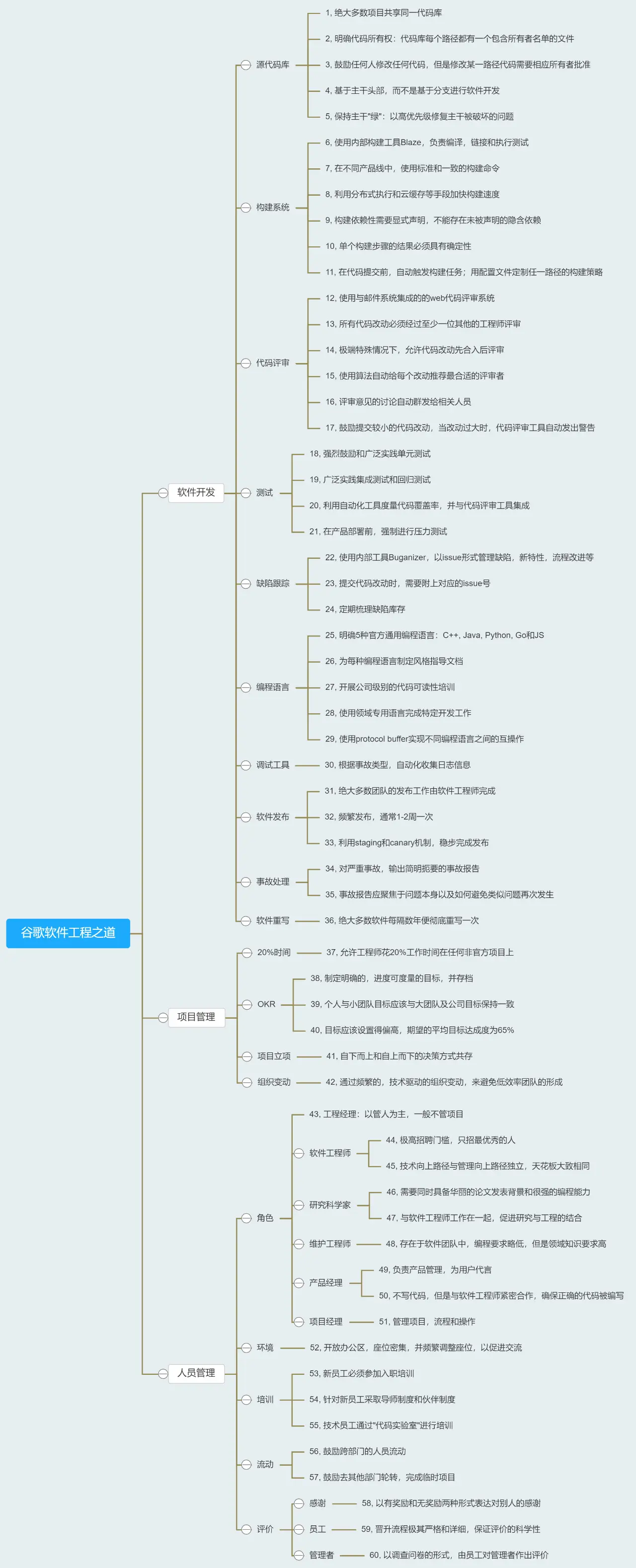 这里,我通过阅读全文,将文中的核心观点进行提炼总结,得出谷歌软件工程60条干货建议,并制作成思维导图,供大家参考!