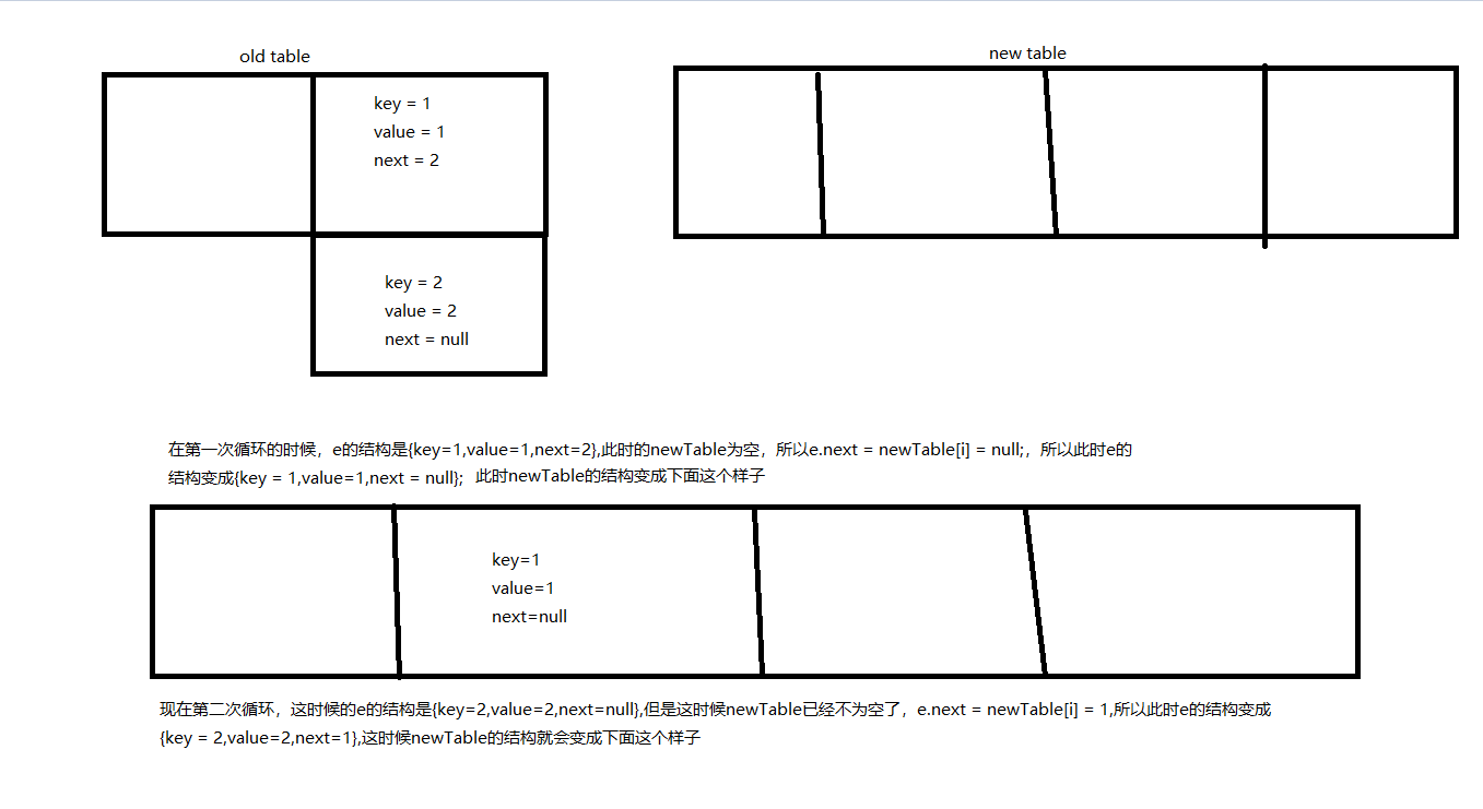 第二幅图文字我在这重复一下:但是这时候Thread-2苏醒了,此时的Thread-2遍历的还是之前的那个old table,所以Thread-2来做第一次循环的时候第一个元素e的结构是{key=1,value=1,next=2},然后Thread-2把这个新的元素移到新的table上去,但是此时的newtable的结构如下