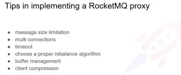 特别提醒一下, Proxy 拉消息都是通过 Slave 去拉,不需要使用 Master 去拉, Master 的 IO 比较重;还有 Buffer 的管理,我们是遇到过这种问题的,如果只考虑 Message 数量的话,会导致 OOM ,所以要注意消息 size 的设置,