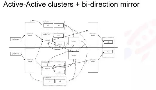 这是 master 和 slave 跨机房去部署的方式。因为我们有一层 proxy ,所以可以很方便的去做流量的调度,让消息只在一个主机房进行消息写入,不需要一个类似中控功能的实体存在。