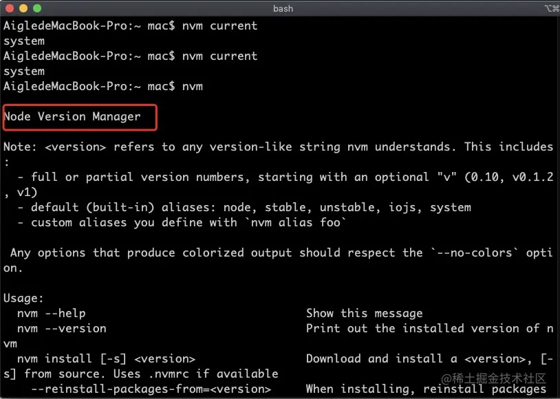 安装完成后最好关闭终端,然后重启输入 nvm 验证是否安装成功,如果出现 Node Version Manager,说明安装是成功的。