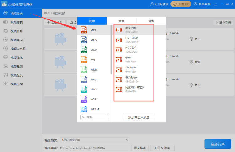 3、根据需要设置好输出格式中相应的参数,输出格式分为视频格式和视频分辨率,输出格式根据需要调整为mp4,分辨率则通常以‘同原文件’为主。