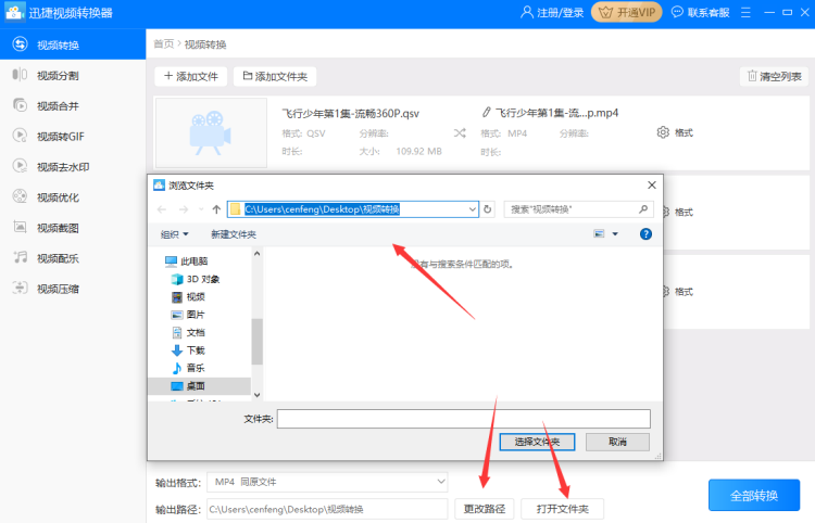 5、随后点击转换或全部转换把添加的qsv格式根据参数转换成mp4输出到对应路径,转换完成后打开之前预设的路径就可以找到并打开mp4格式的视频。