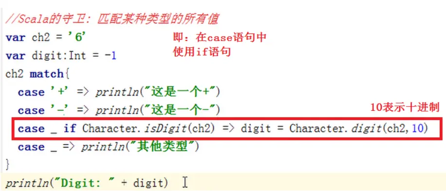 def main(args: Array[String]) { val x = 1 //判断x的值,将结果赋给y //打印y的值 println (y)//支持混合类型表达式 //打印z的值 println (z)//如果缺失else,相当于if (x > 2) 1 else () println (m)//在scala中每个表达式都有值,scala中有个Unit类,写做(),相当于Java中的void println (n)//if和else if else if (x >= 1) 1 else -1 println (k)} }