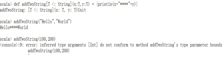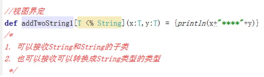 l 但是100和200是可以转成字符串的,所以我们可以使用视图界定让addTwoString方法接收更广泛的数据类型,即:字符串及其子类、可以转换成字符串的类型。