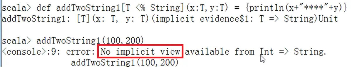 这是因为:Scala并没有定义如何将Int转换成String的规则,所以要使用视图界定,我们就必须创建转换的规则。