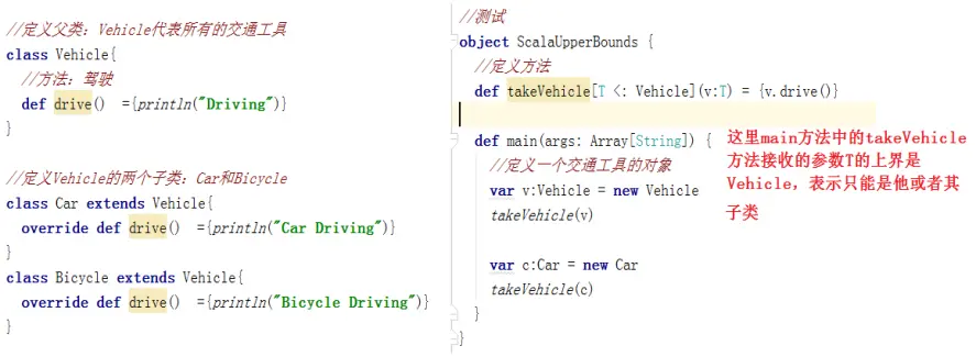 它比 <: 适用的范围更广,除了所有的子类型,还允许隐式转换过去的类型。用 <% 表示。尽量使用视图界定,来取代泛型的上界,因为适用的范围更加广泛。