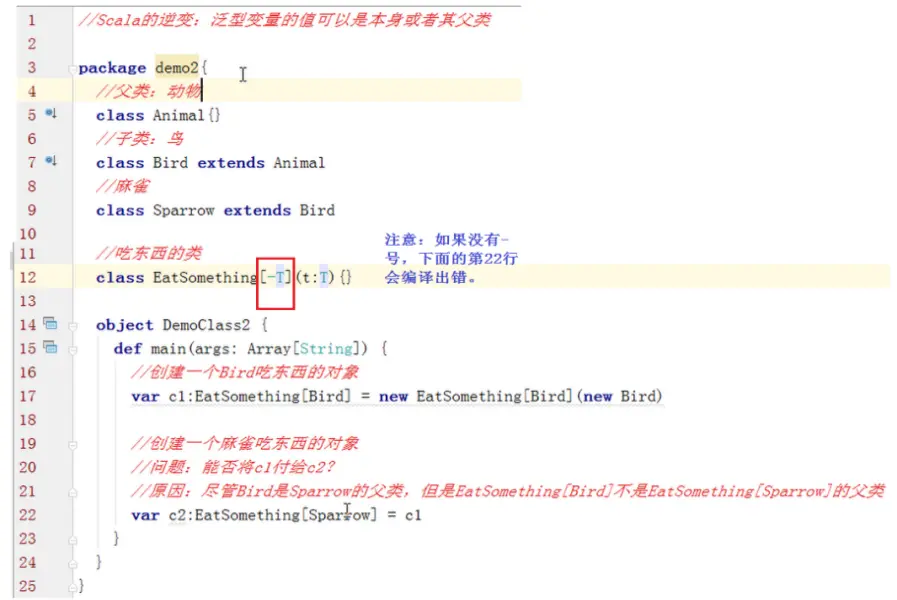 在类或特征的定义中,在类型参数之前加上一个-符号,就可定义逆变范型类和特征了。