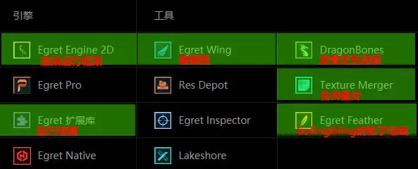 上图绿色的部分是目前所用的东西,其他的暂时没用过;这些东西在下载安EgretLauncher 后可在工具里安装