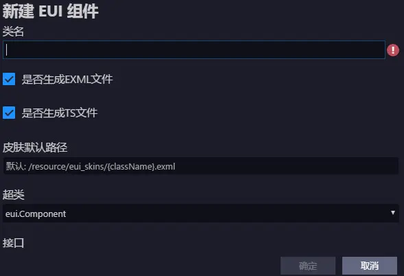 皮肤目录->右键->新建模板->新建eui组件->修改皮肤默认路径(此时的皮肤文件/ts会生成一起,手动把ts 移到 src 相应的目录里就行了)