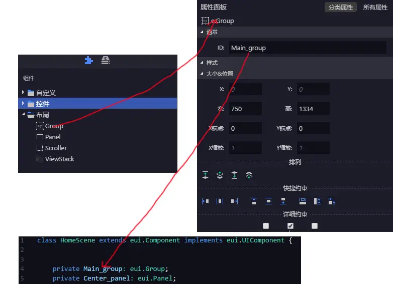 例:resource\skins\game_scene 下的皮肤对应的ts为 src\game\scene;通过ts就可以控制这个场景了,包括pop_ups弹窗皮肤都一样 ,你所创建的eui 都换在这个文件里(resource\default.thm.json)
