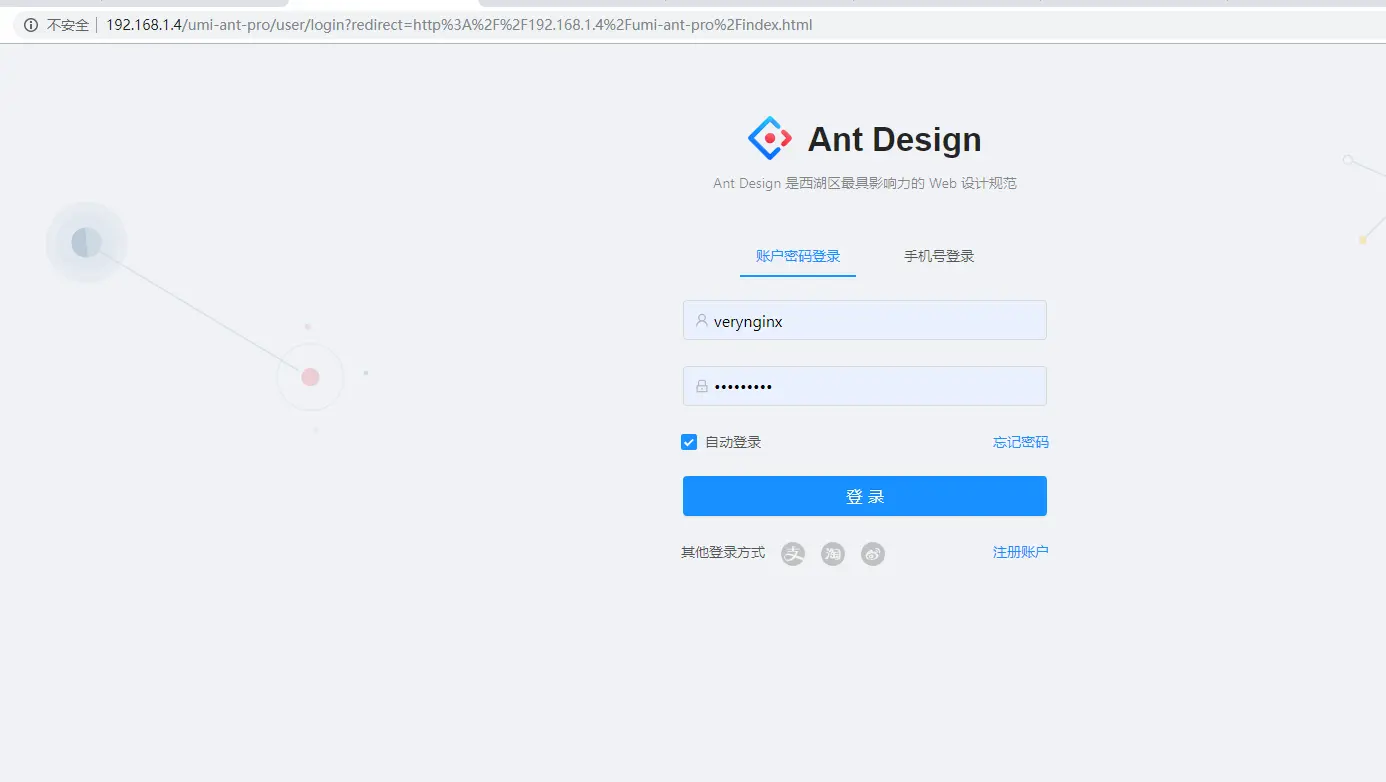 访问效果 http://192.168.1.4/umi-ant-pro/index.html