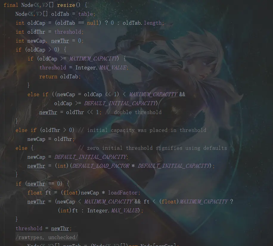 先看看resize()方法前面一部分的,主要是对扩容后的HashMap的各种变量进行赋值,而且可以看待新的Map的长度是之前的2倍。前提是小于最大的长度限制。
