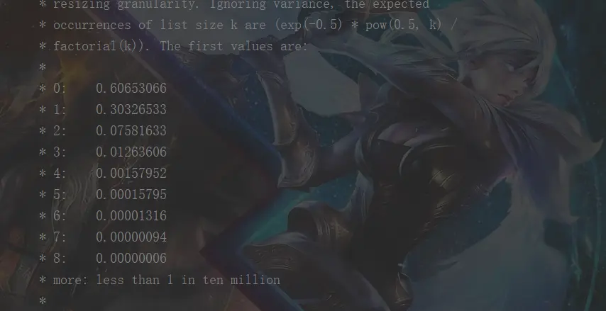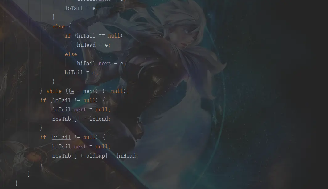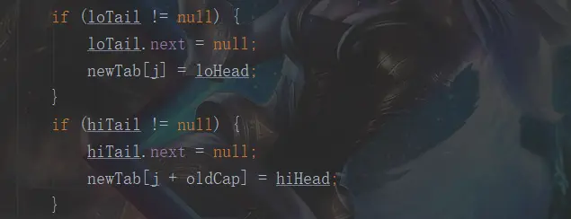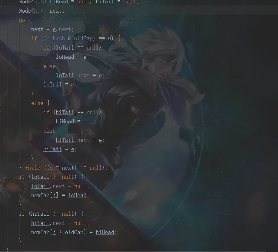整个方法太长我就截了2张图。这里首先设置了4个空的节点 loHead,loTail,hiHead,hiTail。首先会遍历旧的table数组,然后再遍历这个节点下的链表。如果这个节点的第一个元素为 null,或者这个节点只有一个元素,那么就用这和元素的 hash值与 (新的table的长度-1)做【与】运算,然后得到在新的table的桶的位置,将这个元素放进去。如果这个节点的是个树(对不起,能力有限,暂时不明白,其实能形成红黑树的几率非常非常小,在源码中有下面这样的一段注释,就是当链表长度等于8的时候才会转红黑树,但是链表长度等于8的几率是 0.00000006,这个几率几乎是不可能发生的)