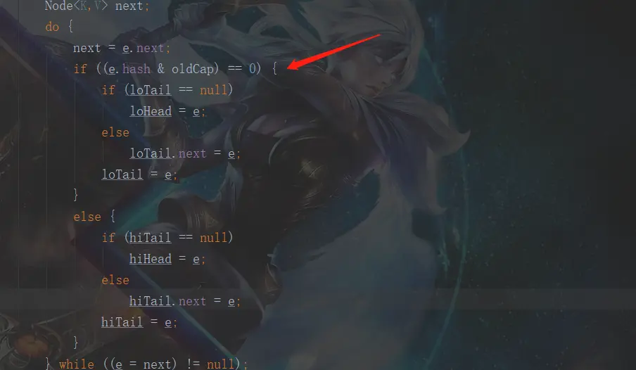 do{}while()循环体有二个判断,首先得到这个元素,然后用这个元素的hash值和老的table长度做与运算。
