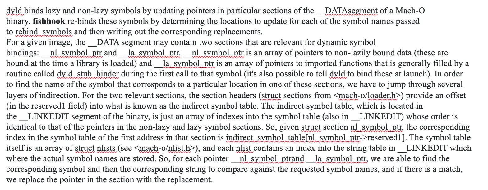 而系统的 C 函数有动态的部分 , 就是我们经常提到的符号表 , 用到的技术叫做 Position Independent Code ( 位置代码独立 ) , fishhook 也就是在此处做了文章 .