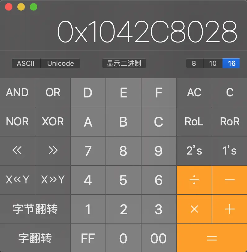 cmd + 3, 选择十六进制 ,cmd + v把Mach-O实际内存地址粘贴进去 , 加上MachOView的符号偏移地址3028.cmd+c拷贝计算结果.