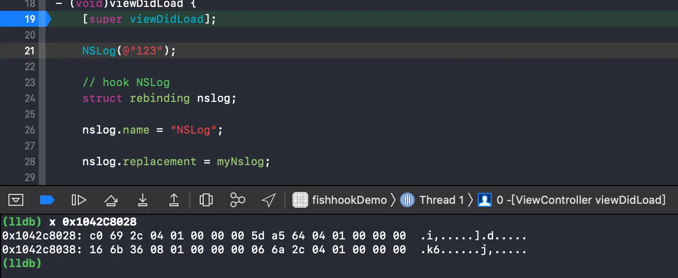 废话不多说 , 来到我们刚刚写的 hook 了 NSLog 的 demo , 在 viewdidload 中先加一句 NSLog(@"123");