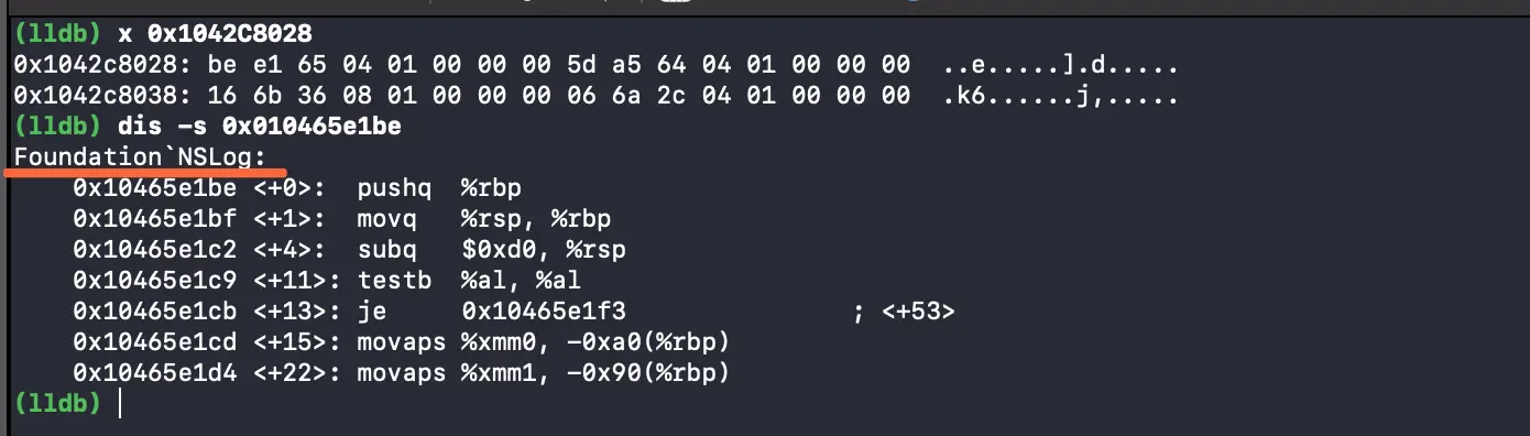 查看汇编 : dis -s 0x01042c69c0 ( 你自己的地址 )