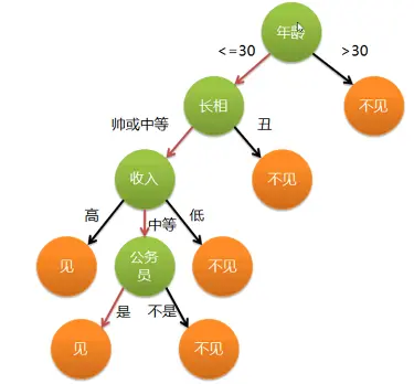 举个例子,比如一个女孩从年龄,长相,收入,职业的层层筛选来判断相亲对象是否值得见上一面。 如下图