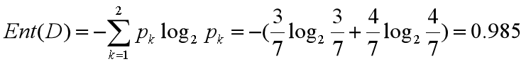 我们基于 ID3 的算法规则,完整地计算下我们的训练集,训练集中一共有 7 条数据,3 个打篮球,4 个不打篮球,所以根节点的信息熵是: