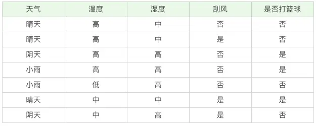 假设现有打篮球的数据集,训练数据如下: