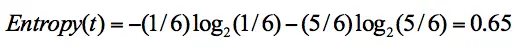 在集合 1 中,有 6 次决策,其中打篮球是 5 次,不打篮球是 1 次。那么假设:类别 1 为“打篮球”,即次数为 5;类别 2 为“不打篮球”,即次数为 1。那么节点划分为类别 1 的概率是 5/6,为类别 2 的概率是 1/6,带入上述信息熵公式可以计算得出: