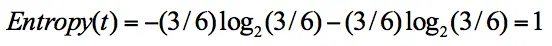同样,集合 2 中,也是一共 6 次决策,其中类别 1 中“打篮球”的次数是 3,类别 2“不打篮球”的次数也是 3,那么信息熵为多少呢?我们可以计算得出: