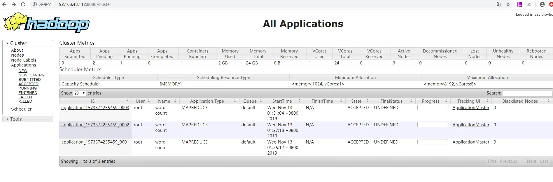 浏览器访问:http://192.168.48.112:8088/cluster