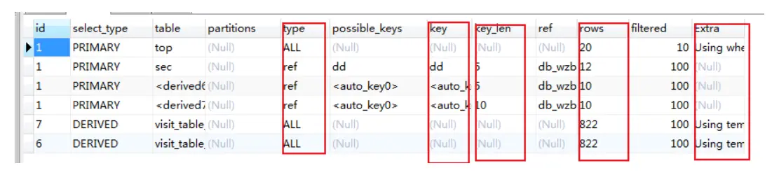 - key列,使用到的索引名。如果没有选择索引,值是NULL。可以采取强制索引方式。