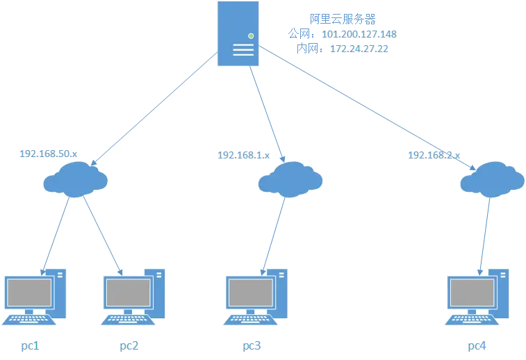 最近需要让移动的小车进行通信,小车采用USB转4G模块和外部进行通信,相当于车体携带一个移动的热点。我需要让这些小车之间可以相互通信以实现多车协同的目的,每个小车携带一个移动热点也就是一个局域网,其实也就是实现不同局域网内的主机相互通信。这样搭建一个虚拟个人网就可以实现我们的需求。网络拓扑图如下: