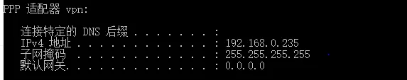 保存然后连接即可。使用ipconfig查看windows下的ip地址,vpn连接就是ppp网卡,下图表示客户端已经连接成功了。