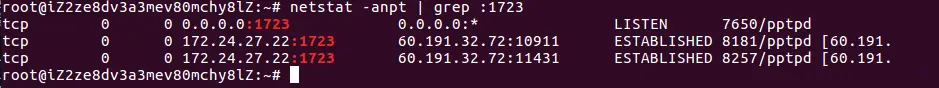 按照上面的操作分别连接了一台windows的pc和一台ubuntu的pc到服务器,我们使用netstat -anpt | grep :1723查看服务器显示有几台设备连接。如下图显示有两台设备连接上,和我们的预期相同。