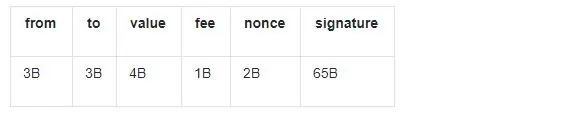 以上 transaction 各字段的长度仅作参考,在实现具体系统的时候需要根据实际情况调整字段长度,以防止发生字段溢出的情况,但原则上还是能省则省。因为交易数据越少,在相同存储容量的前提下,所能容纳的交易数也就越多。