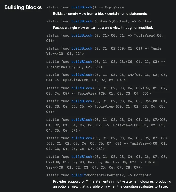 也就是说,content 里的可以被「包含」的对象,只要是 View 类型即可,这一点很完美,但 @ViewBuilder 是什么?文档中的定义为:
