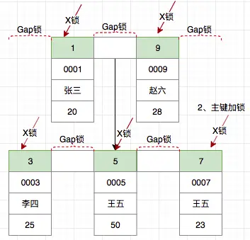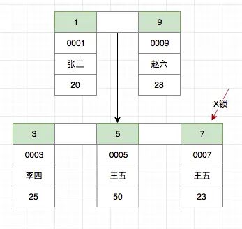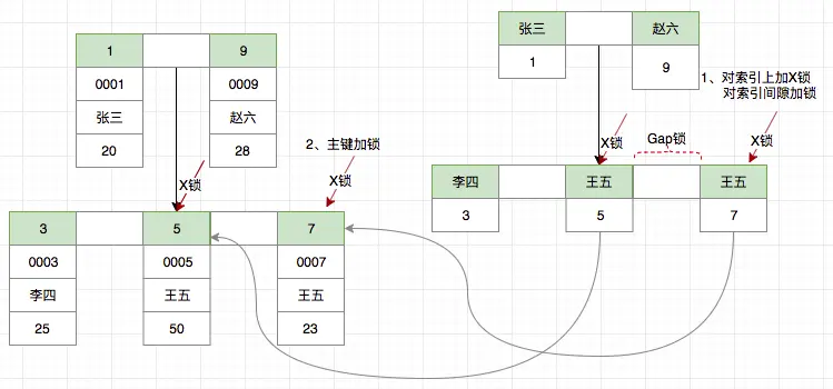 由于使用索引为二级索引,Innodb 首先通过索引对数据进行过滤,由于普通索引不能保证影响数据范围唯一,有可能其他的事务在对二者之间的间隙操作添加新数据,因此还需要对于王五之间的间隙进行加锁,以防有其他事务在事务提交前在此间隙插入数据,最后还需要在聚集索引上对主键=5,7 的数据进行加X锁。