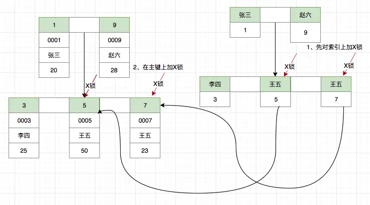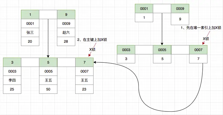 由于唯一索引为二级索引,Innodb 首先通过索引对数据进行过滤,对于王五的两条索引加X锁,然后还需要在聚集索引上对主键=5,7 的数据进行加X锁。