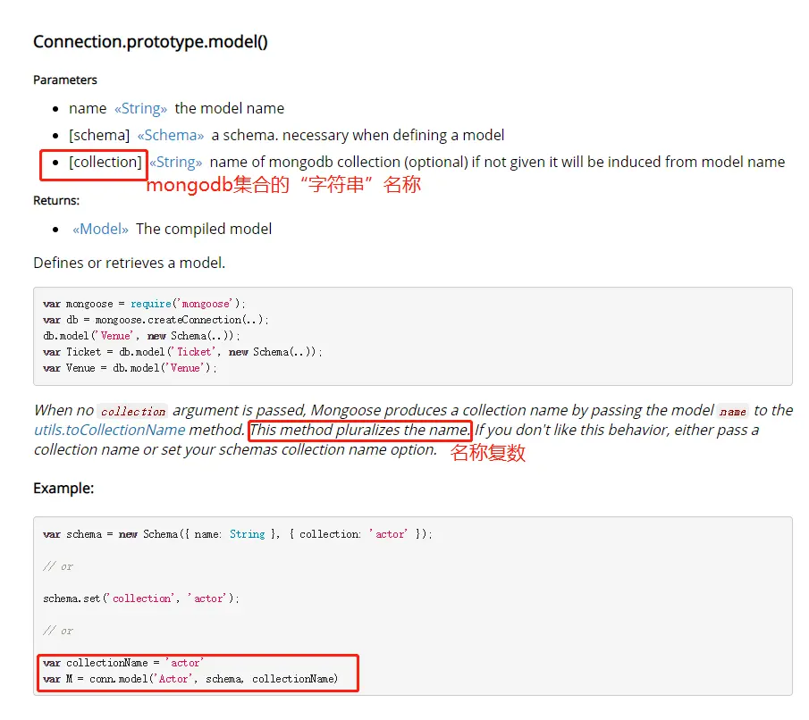 查阅了官方文档才知道,当没有传递collection参数时,Mongoose通过将模型名称传递给utils.toCollectionName方法来生成集合名称,可以通过下面文档给出的demo设置自己的schema集合名称: