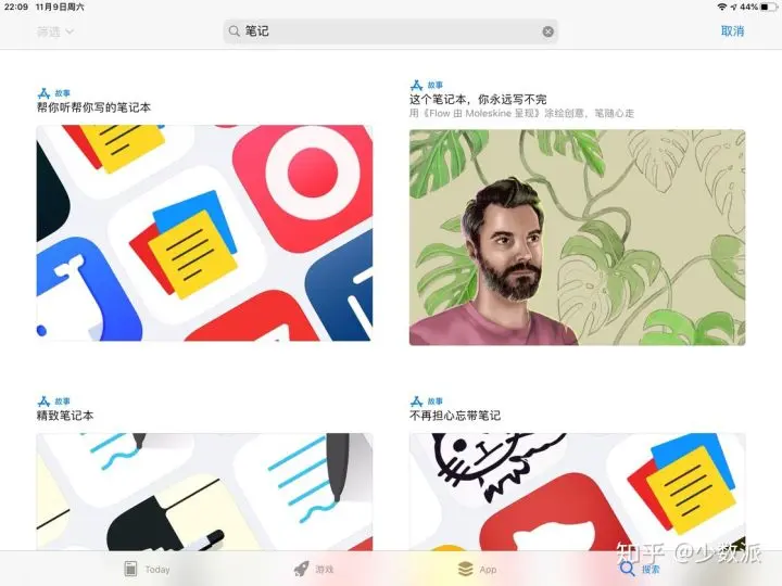 除了能在「今日」页面看到推荐的「故事」外,你也可以直接用关键词来搜索。比如你想找一个笔记应用,就可以在 App Store 的搜索栏输入「笔记」后,点击「在故事中搜索『笔记』」。