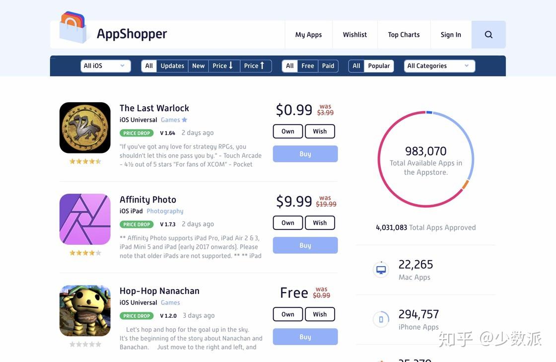AppShopper 是一款老牌 App 监控工具,你不但可以用它来追踪特定 App 的降价情况,也可以查看到 App Store 上又有哪些应用限免、冰点了。AppShopper 收纳了 App Store 上的近百万个可用的 App,包括 iOS、iPadOS 和 macOS 平台的 App 都能在 AppShopper 中找到。