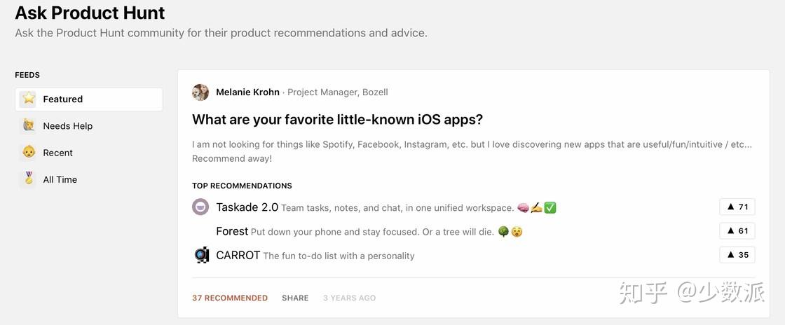 Product Hunt 的「问答」则更像是一个社区,你可以在里面发问或是回答别人的问题。由于采用了问答的机制,你可以获得更多视角的应用推荐。比如在「你最喜欢哪个小众应用」的问题下,你就能找到各式各样的 App,如果这个 App 登陆了 Product Hunt,应用卡片的「View Product」前还会有一个小小的 Product Hunt 图标以作区别。