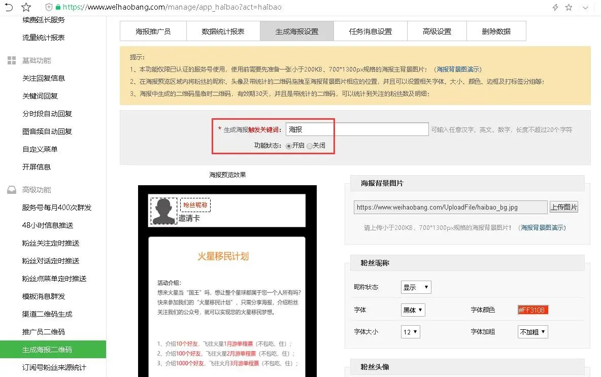 使用微号帮平台生成海报二维码功能,实现海报通裂变粉丝,带粉丝头像、昵称、二维码,分享粉丝海报关注自动生成海报。
