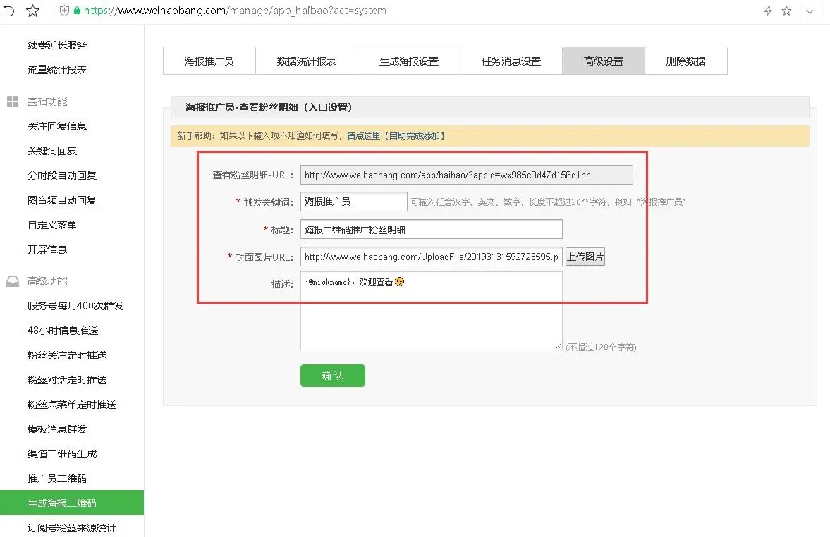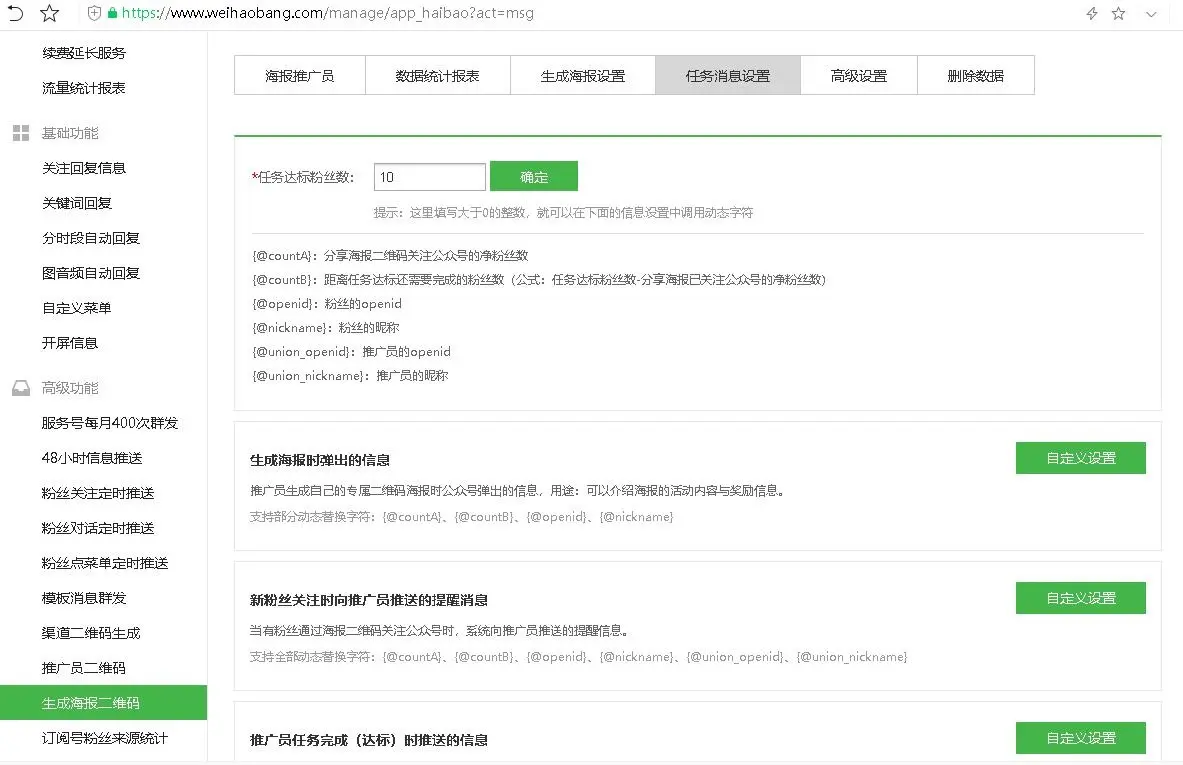 可以设置【生成海报时弹出的信息,新粉丝关注时向推广员推送的提醒消息,推广员任务完成(达标)时推送的信息,粉丝重复取关公众号后再扫海报二维码关注时弹出的信息,老粉丝扫海报二维码时弹出的信息】这些消息,还可以搭配动态字符,任务达标数。