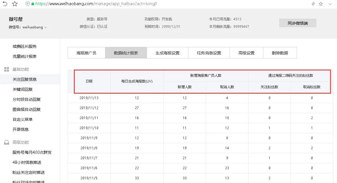 通过生成海报二维码》数据统计报表查看每天海报分享粉丝关注数据。