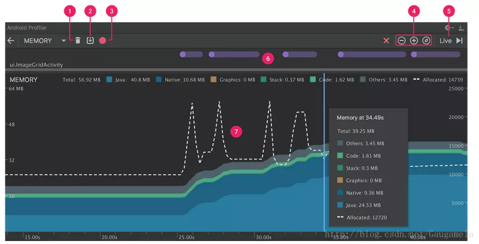 打开Memory Profiler后,主界面如下所示(为了方便,这里直接盗取Android技术文档中的图):
