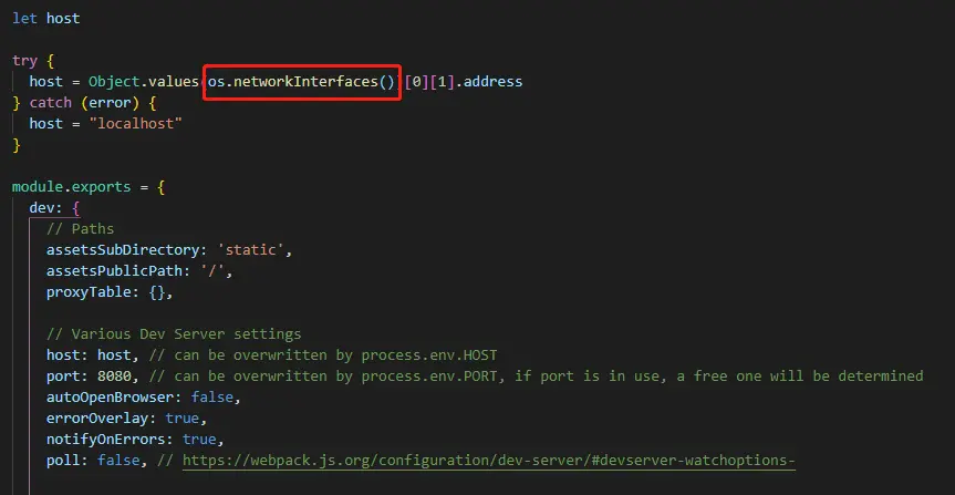 vue-cli 使用本机地址启动服务 turing 2019-11-13 130 阅读1分钟 大多数时候,我们启动vue-cli项目后,服务地址都是http://localhost:8080,这样的地址在我们协同开发,本地联调的时候都不太方便。那我们该如何配置呢? 开始 打开这个文件,导入os这个包 os.networkInterfaces()可以获得本机的ip信息 因为只是开发环境使用,所以就用稍简单粗糙些的写法 几乎这样就能满足需求了