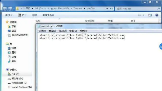 “ start C:\"Program Files (x86)"\Tencent\WeChat\WeChat.exe”,注意路径中引号的位置,如果你的安装路径不是在这里,请修改为自己目录。输入两行就是同时开两个微信,想开几个就复制粘贴几行。保存后将文件扩展名由“txt”改为“bat”。