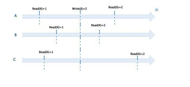 - 以带多副本的分布式存储系统为例,所有连接到分布式系统的客户端看到的某一数据的值都是一样的。当某个客户端修改了这个值,后续的所有客户端都能读取到这个更新的值,并且所有的更新操作都在这个新的值的基础上进行,直到这个值被再次修改,如下图所示,在A修改X前所有客户端都能读取到X的值为1,在A将X修改为2之后,所有客户端都能读取到这个更新后的值。