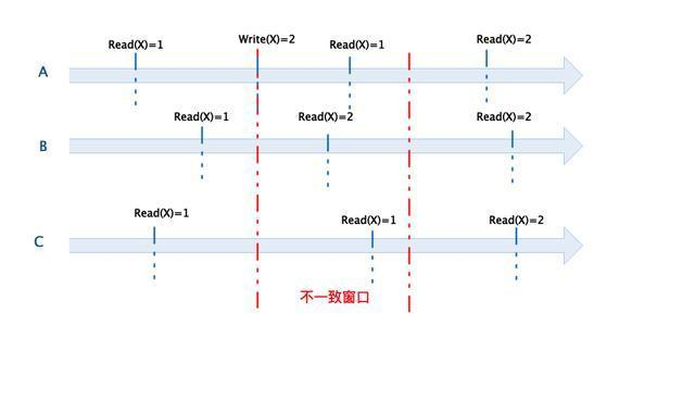 - 如下图所示,在A将X修改为2后,在不一致窗口内只有B能读取到X=2,其他客户端读取到的依旧是X=1。但是在不一致窗口后,所有客户端都能读取到X=2。